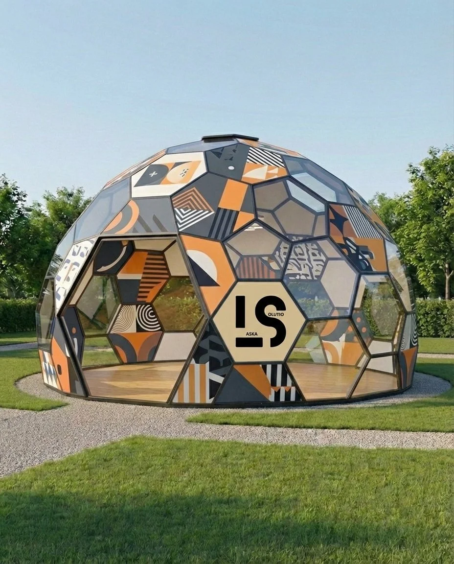 Trasforma ogni evento in un’esperienza visiva immersiva con il nostro padiglione geodetico personalizzabile. Questa struttura unisce l'eleganza architettonica della sfera alla massima libertà espressiva: un perfetto equilibrio tra superfici opache, interamente rivestibili con grafiche, texture e colori del tuo brand, e moduli trasparenti che inondano l'interno di luce naturale.